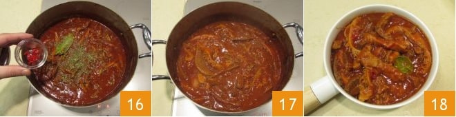 20 minutes avant la fin de la cuisson, assaisonnez le Morzello avec les arômes : le laurier, l'origan et le piment haché 16. Une fois le temps écoulé, le Morzello sera prêt à être servi (17-18).