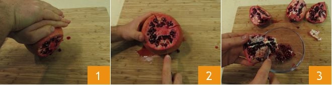 Pour préparer le moscow mule à la grenade, commencez par nettoyer le fruit. Enlevez le chapeau en l'incisant avec un couteau à lame lisse. Faites pivoter le fruit sur la planche à découper sous vos mains 1, de cette façon la pulpe s'adoucira. Incisez les 4 parties blanches et bien visibles 2 et commencez à égrener le fruit. Avec cette opération tout juste terminée, cela devrait être plus facile de détacher les graines. Rassemblez-les dans un bol 3