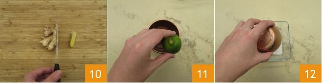 Une fois le temps écoulé, passez à la décoration des tasses typiques pour moscow mule ou des verres. Coupez 4 tranches de gingembre et 4 de citron vert 10, avec l'autre moitié du citron, humidifiez le bord du verre en frottant la pulpe sur le bord du verre 11. Puis givrez le bord en plongeant la partie humide dans le sucre 12.