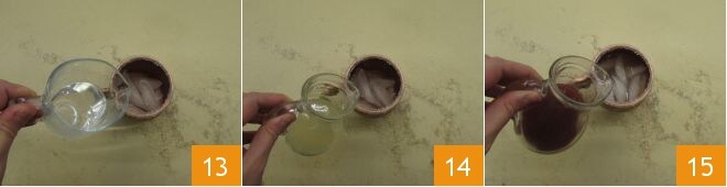Remplissez à moitié les récipients avec de la glace, et pour chacun versez 45 grammes de vodka 13, 80 g de ginger beer 14 et ¼ du sirop de grenade 15.
