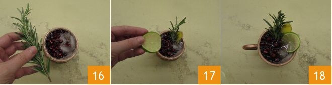 Mélangez bien et complétez avec 1 cuillerée de grains de grenade, 1 brin de romarin 16, une tranche de gingembre et une de citron 17 et voilà votre Moscow mule à la grenade prêt, il ne vous reste plus qu'à le déguster très frais 18.