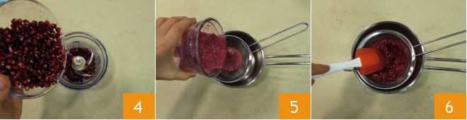 puis mixez le tout 4. Passez le tout dans un tamis 5 et obtenez le jus en pressant avec une spatule 6.