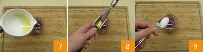 Transférez le jus dans un récipient, ajoutez le jus de 2 citrons verts 7, pressez 1 racine de gingembre épluchée 8 et enfin versez le sucre. Mélangez le tout et laissez macérer pendant quelques heures 9.