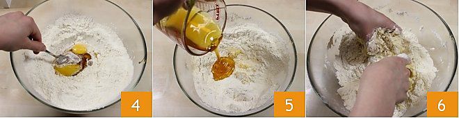 commencez ensuite à battre avec une fourchette pour rassembler les ingrédients 4 et ajoutez le reste du miel 5. Ajouter le miel en plusieurs fois facilitera le travail de la pâte, mais si vous êtes plus expérimenté, vous pouvez ajouter les ingrédients en une seule fois et pétrir immédiatement. Pétrissez les ingrédients avec les mains 6 et si nécessaire, ajoutez plus de farine.