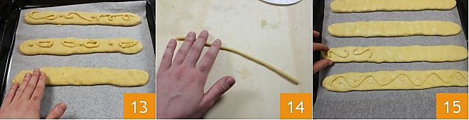 Disposez les mostaccioli sur une plaque recouverte de papier sulfurisé 13. Avec le reste de la pâte, formez de petites baguettes fines 14 ou des boules et créez les décorations à placer sur la surface 15.