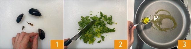 Pour préparer les moules marinières, commencez par vous occuper du Comment nettoyer et ouvrir les moules. Retirez ensuite le byssus et rincez-les 1. Hachez ensuite finement le persil lavé. Versez l'huile dans une casserole à bords hauts 3.