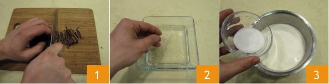 Pour préparer la mousse au chocolat avec sablés à l'orange, commencez par hacher finement le chocolat 1 et à faire tremper les feuilles de gélatine pendant 10 minutes, dans un bol rempli d'eau froide 2. Pendant que la gélatine atteint la bonne consistance, versez la crème dans une petite casserole et ajoutez le sucre 3