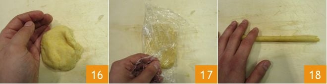 jusqu'à obtenir une pâte compacte, formez un pâton 16. Enveloppez la pâte dans un film plastique et laissez-la reposer au réfrigérateur pendant 30 minutes 17. Après ce temps, transférez à nouveau la pâte sur le plan de travail et modelez-la avec la paume de la main pour obtenir des boudins 18,