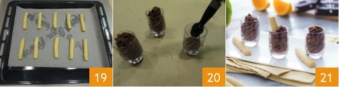que vous couperez pour former des bâtonnets d'environ 7 mm de diamètre et longs de 8-9 cm. Disposez les sablés sur une plaque à pâtisserie recouverte de papier sulfurisé 19 et enfournez pendant 12 minutes, ou jusqu'à ce qu'ils soient dorés, dans un four statique préchauffé à 180°C (si ventilé, à 160°C pendant 5-6 minutes). Une fois le temps de repos de la mousse écoulé, retirez le siphon du réfrigérateur et équipez-le d'une douille étoile. Secouez-le bien et remplissez les verrines de mousse 20. Votre mousse peut être servie, accompagnée des sablés à l'orange 21 disposés séparément ou à l'intérieur des verrines.