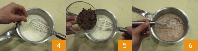 puis chauffez le tout jusqu’à ce que le sucre soit complètement dissous. Éteignez le feu, retirez la gélatine de l'eau et après l'avoir bien essorée, ajoutez-la à la crème 4 : mélangez soigneusement avec un fouet pour dissoudre complètement la gélatine. Ajoutez également le chocolat 5 en mélangeant continuellement jusqu'à ce qu'il soit complètement fondu 6.