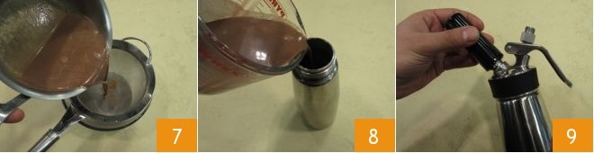 Filtrez ensuite la préparation en la faisant passer à travers un tamis 7 : il est très important qu'il n'y ait pas de grumeaux ni de chocolat ni de gélatine. Sans nécessairement attendre qu’elle refroidisse, versez la crème dans le siphon 8, fermez-le bien et insérez la cartouche de gaz 9. Secouez le siphon une dizaine de fois et laissez reposer au réfrigérateur entre 3 heures et 12 heures.