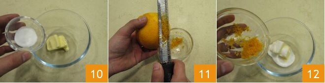 En attendant, préparez les sablés. Dans un grand bol, placez le beurre à température ambiante, auquel vous devez ajouter le sucre 10. Lavez bien une orange non traitée et râpez-en le zeste 11, puis ajoutez-le au beurre et au sucre 12.