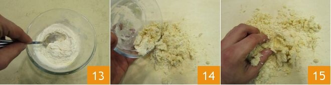 Enfin, ajoutez la farine tamisée et mélangez bien tous les ingrédients 13. Transférez la pâte encore friable sur un plan de travail 14 et façonnez brièvement la pâte 15