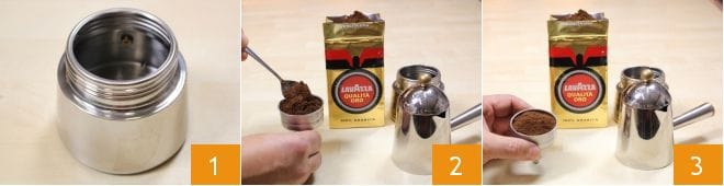 Pour réaliser la mousse au café en tasse avec cantucci, commencez par préparer le café avec la moka : mettez de l'eau froide, de préférence pauvre en calcaire, dans la chaudière jusqu'à la soupape de sécurité 1 (sinon vous obtiendrez un café plus long). Remplissez le filtre avec le café moulu 2 et nivelez à chaque cuillère de café ajoutée en tapant le filtre sur la table avec des mouvements fermes 3, jusqu'à atteindre le bord du filtre.