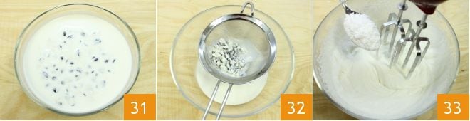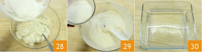 et incorporez-la délicatement à la meringue 28. Ajoutez le mélange de crème et gélatine 29 et laissez raffermir la mousse au réfrigérateur pendant au moins 2 heures. La mousse foncée est prête, consacrez-vous maintenant à la mousse claire : mettez la gélatine à ramollir dans l'eau froide 30,
