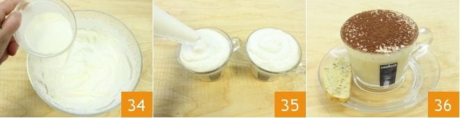 Ajoutez la gélatine fondue à la mousse 34 et laissez raffermir la mousse au réfrigérateur pendant au moins 2 heures. Après ce temps, vous pouvez composer le dessert : prenez des verrines et versez ¾ de mousse foncée avec une poche à douille, puis complétez la surface avec la mousse claire 35. Terminez en saupoudrant de cacao amer 36. Servez la mousse au café en tasse accompagnée des cantucci aux noisettes.