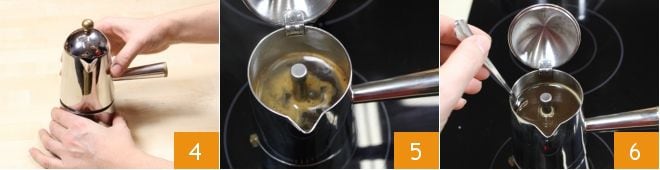 Ne pressez pas avec la cuillère, ne faites pas de trous et vissez bien la cafetière 4 (pour éviter que le café ne s'échappe sur les côtés pendant qu'il monte), puis placez-la sur une flamme basse et constante, pour obtenir un café corsé. Au fur et à mesure que le café monte, une mousse dense se formera 5 ; il est conseillé de ne pas laisser bouillonner trop longtemps le café, pour en maintenir intacts l'arôme et la douceur. Ensuite, éteignez le feu et votre café est prêt à être utilisé dans la préparation : mélangez-le directement dans la moka avec une cuillère pour le rendre plus homogène 6.