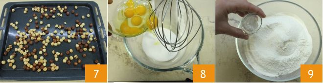 Maintenant, occupez-vous de la préparation des cantucci : commencez par préchauffer le four à 190°, et lorsqu'il aura atteint la température, faites-y griller les noisettes bien disposées sur une plaque 7 pendant 3-4 minutes ; retirez-les ensuite du four et laissez-les refroidir. Procédez ensuite à former la pâte pour les cantucci : mettez les 4 œufs entiers et un jaune dans le robot 8 (ou dans un grand bol) et ajoutez le sel et le sucre semoule. A part, tamisez les farines et ajoutez la levure 9