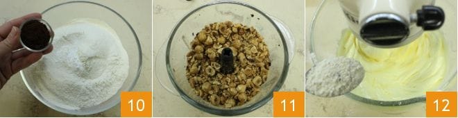 et le café en poudre 10. Hachez grossièrement les noisettes avec le mixeur 11. Ensuite, lorsque le mélange d'œufs et de sucre sera clair et mousseux, versez les poudres 12