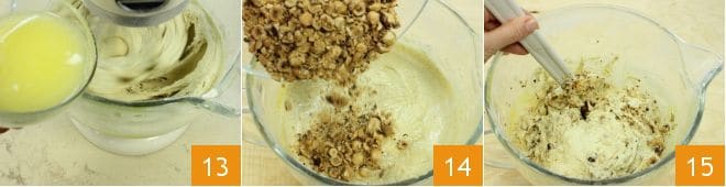 Ajoutez maintenant le beurre fondu 13, les noisettes 14 et mélangez pour obtenir un mélange friable et moelleux 15.