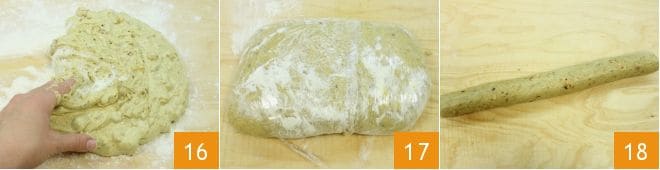 Transférez le mélange sur un plan de travail fariné 16 et compactez-le à la main pour obtenir une boule uniforme. Couvrez le pâton avec du film plastique 17 et placez-le au réfrigérateur pour raffermir pendant au moins une demi-heure. Après ce temps, reprenez la pâte, formez 3 boudins d'environ 30 cm de long 18;