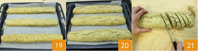 transférez les boudins sur une plaque de cuisson recouverte de papier sulfurisé, badigeonnez-les avec l'œuf entier 19 légèrement battu et faites cuire pendant 20 minutes dans un four préchauffé à 190°. Après ce temps, sortez les boudins 20, laissez-les refroidir quelques minutes et procédez à les couper en diagonale 21 pour obtenir des biscuits (cantucci) d'environ 1-1,5 cm.