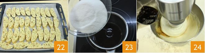 Disposez les biscuits obtenus à nouveau sur la plaque et faites-les "biscotter" au four à 170° pendant environ 10-15 minutes 22. Maintenant, vous pouvez vous consacrer à la mousse foncée en préparant la meringue au café : Placez dans une petite casserole à fond épais 30 ml de café et 75 g de sucre semoule 23, chauffez le mélange à feu doux et remuez pour dissoudre le sucre ; dès que le sirop commence à bouillir, plongez-y le thermomètre de cuisine, qui vous indiquera la température, lorsque le sirop aura atteint 116°. Commencez à monter les blancs en neige à vitesse moyenne avec un robot équipé de fouets et dès qu'ils deviennent blancs, ajoutez 50 g de sucre. Les blancs doivent déjà être bien montés lorsque le sirop atteint 121°C. Lorsque le sirop a atteint la température indiquée ci-dessus, versez-le en filet dans les blancs 24,