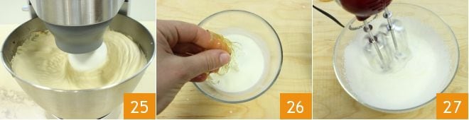 en continuant à monter avec les fouets jusqu'au refroidissement complet de la meringue 25. Faites tremper la gélatine dans l'eau froide pour l'adoucir, puis faites-la fondre dans 50 ml de crème tiède 26. A part, montez 150 ml de crème avec un fouet électrique 27 en suivant le guide comment monter la crème.