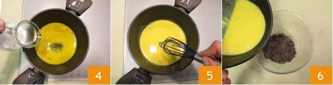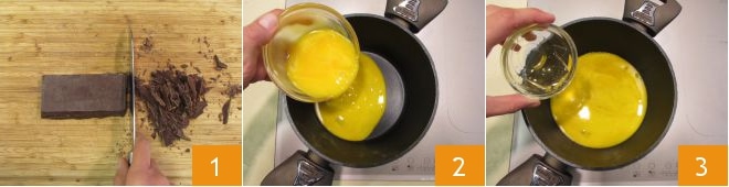 Pour préparer la mousse au chocolat, commencez par hacher le chocolat noir 2 et transférez-le dans un bol. Passez à la crème anglaise : dans une casserole antiadhésive, versez les jaunes d'œufs 2 et le miel 3.