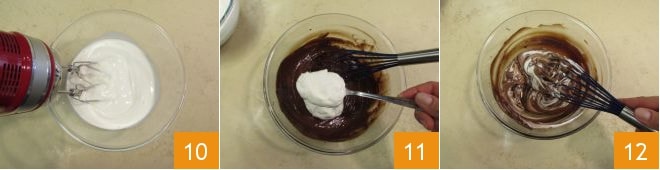 Maintenant, fouettez rapidement la crème 10 : elle ne doit pas être ferme, mais très souple. Ajoutez-en un peu dans la crème au chocolat 11 et mélangez avec un fouet pour unifier la densité du chocolat 12.