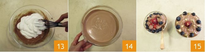 Incorporez le reste de la crème en deux fois 13 en mélangeant énergiquement par des mouvements rotatifs de bas en haut. Votre mousse au chocolat est prête 14 ! Vous pouvez la transférer dans des verrines et la décorer 15, sinon conservez-la au réfrigérateur jusqu'au moment de l'utiliser.