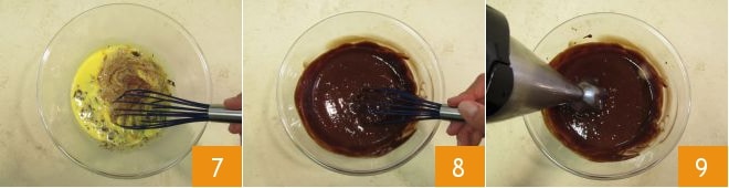 Mélangez avec le fouet 7 jusqu'à ce que le chocolat soit complètement fondu 8. La crème doit être brillante 8. À ce stade, travaillez la crème avec un mixeur plongeant jusqu'à ce qu'elle soit lisse et brillante 9.
