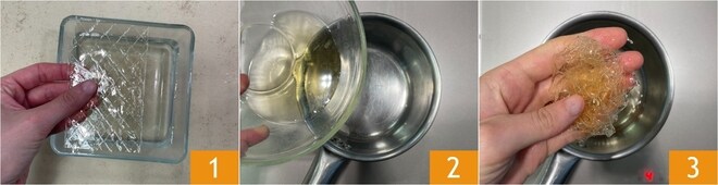 Pour réaliser la mousse de figues et fruits secs, commencez par faire tremper les feuilles de gélatine dans l'eau froide 1. Versez le rhum dans une petite casserole et chauffez-le doucement 2, puis ajoutez les feuilles de gélatine bien essorées 3.