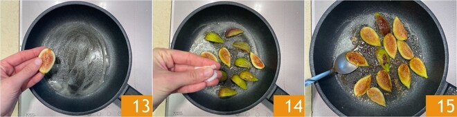 Disposez les figues dans la poêle 13, puis ajoutez le sucre 14 et faites-les revenir à feu moyen-élevé pendant quelques minutes, jusqu'à ce qu'elles prennent couleur 15.