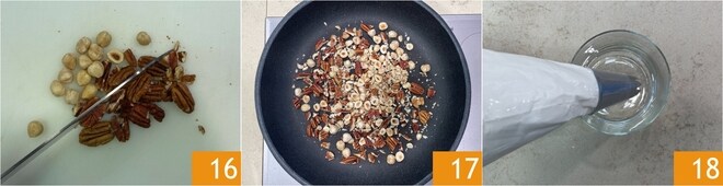 Enfin, hachez grossièrement les noix de pécan et les noisettes 16, puis faites-les griller brièvement dans la poêle 17. Vous êtes prêts à assembler le dessert : remplissez 2 verrines de 200 ml de capacité avec la mousse que vous aurez transférée dans une poche à douille avec une douille étoile de 8 mm 18.