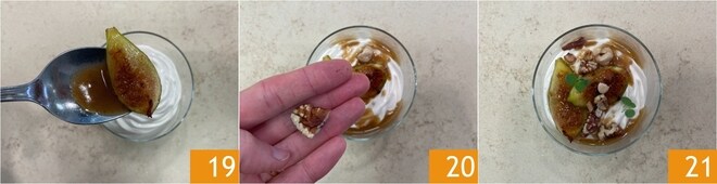 Garnissez les verrines avec les figues 19 et les fruits secs 20, puis complétez avec les feuilles de marjolaine. Votre mousse avec des figues et des fruits secs est prête à être servie 21 !