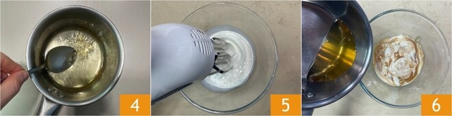 Mélangez avec une petite cuillère pour dissoudre complètement la gélatine 4 et laissez tiédir. Pendant ce temps, montez la crème à moitié avec un batteur électrique 5. Versez le yaourt au caramel dans un bol, puis ajoutez le rhum tiédi avec la gélatine 6.