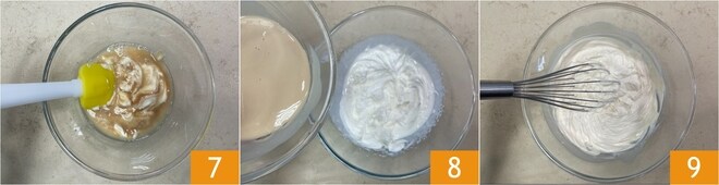 Mélangez pour amalgamer le mélange 7, puis incorporez la crème semi-montée 8 et incorporez-la avec un fouet à main 9.