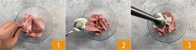 Pour préparer la mousse de mortadelle, placez les tranches de mortadelle dans un bol 1, ajoutez la ricotta de vache 2 et mixez avec le mixeur plongeant 3.
