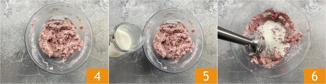 Lorsque le mélange est homogène 4, versez la crème fraîche liquide 5. Mixez à nouveau avec le mixeur plongeant 6.