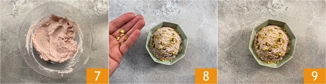 Vous devez obtenir une crème lisse et veloutée 7. Transférez la mousse dans un petit bol et garnissez avec des pistaches hachées 8. Accompagnez la mousse de mortadelle 9 avec des crostinis ou des gressins, ou utilisez-la pour garnir des vol-au-vent !