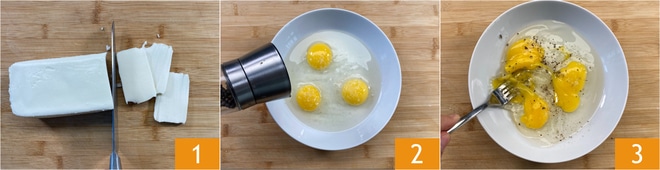 Pour préparer la mozzarella et le jambon en carrozza, coupez la mozzarella en tranches fines 1. Dans une assiette, cassez 3 œufs, assaisonnez de sel et de poivre 2 et battez-les avec une fourchette 3.