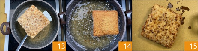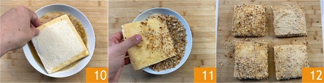 Ensuite, recouvrez tout le pain avec l'œuf 10. Enfin, panez dans le mélange de chapelure 11. Vous obtiendrez 4 pièces 12 avec ces quantités.