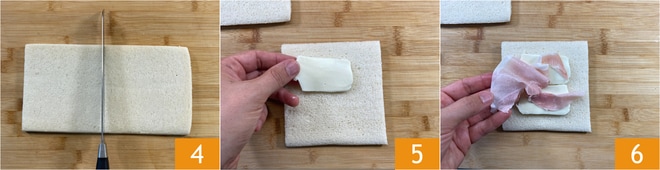 Découpez 8 tranches carrées de pain d'environ 12 cm 4, si vous trouvez du pain déjà tranché, c'est encore mieux. Garnissez chaque tranche de mozzarella 5 et de jambon cuit 6.