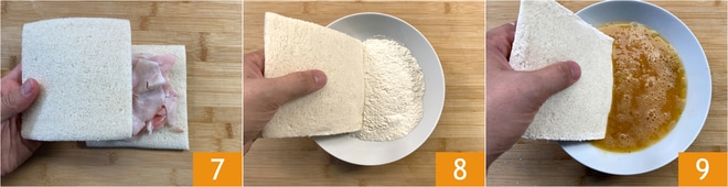 Fermez avec une autre tranche de pain 7 et aplatissez délicatement les bords. Passez maintenant d'abord dans la farine 8, puis scellez bien tout le bord dans l'œuf 9.