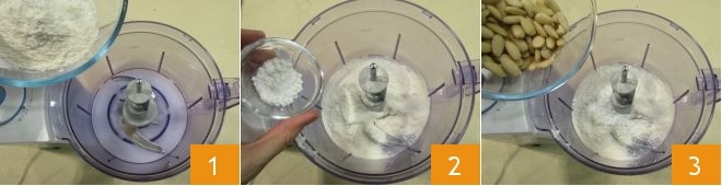Pour préparer les muffins 5 minutes, versez dans le bol d'un mixeur équipé de lames la farine T45 1 et la levure chimique 2. Ajoutez également les amandes 3,