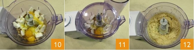 Une fois tous les ingrédients ajoutés 10, fermez le mixeur 11 et mixez le tout jusqu'à obtenir un mélange crémeux, lisse et homogène 12.