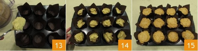 Disposez les caissettes dans un moule à muffins et à l'aide d'une cuillère, transférez-y la pâte sans dépasser les 2/3 de la capacité (13-14) ; vous devrez répartir environ 65 g de pâte par caissette. Faites cuire dans un four statique préchauffé à 170° pendant environ 25 minutes ; faites toujours le test du cure-dent et une fois cuits, sortez-les du four 15 et dégustez vos muffins 5 minutes !