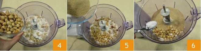 les noisettes émondées 4, le sucre de canne 5 et la demi-cuillère à café de sel 6.