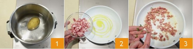 Pour préparer les muffins de pommes de terre, commencez par faire bouillir la pomme de terre dans de l'eau légèrement salée 1 ; faites-la cuire jusqu'à ce que vous puissiez la percer avec les dents d'une fourchette (cela prendra environ 30 minutes, mais vous pouvez réduire le temps de moitié en utilisant une cocotte-minute). Pendant ce temps, dans une poêle, chauffez un filet d'huile et ajoutez les dés de bacon fumé 2 ; faites-les revenir quelques minutes et assaisonnez-les avec des feuilles de thym 3.